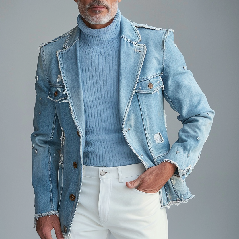 Men's Notched Lapel Two Button Ripped Denim Blazer