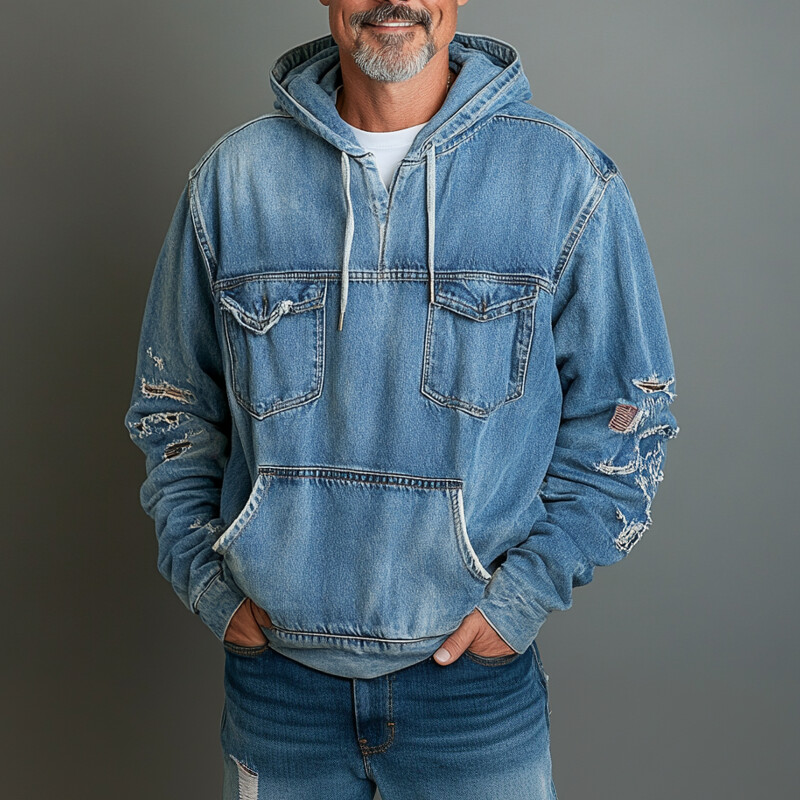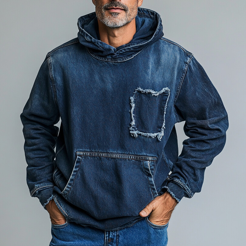 Men's Washed Denim Raw Edge Pocket Long Sleeve Casual Hoodie