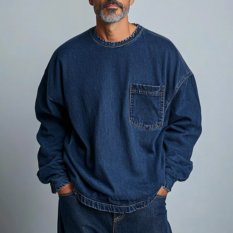 Men's Casual Crew Neck Denim Chest Pocket Sweatshirt
