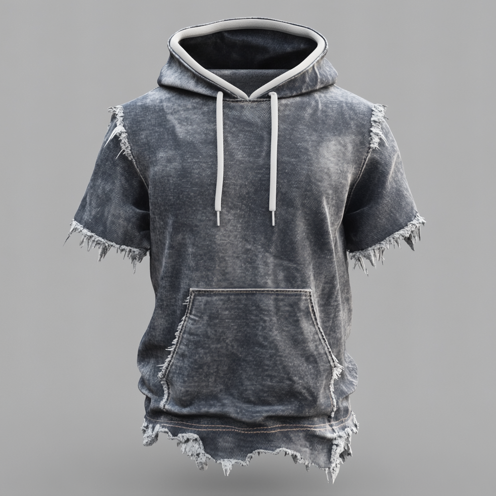 Men's Casual Denim Raw Edge Pocket Long Sleeve Drawstring Hoodie