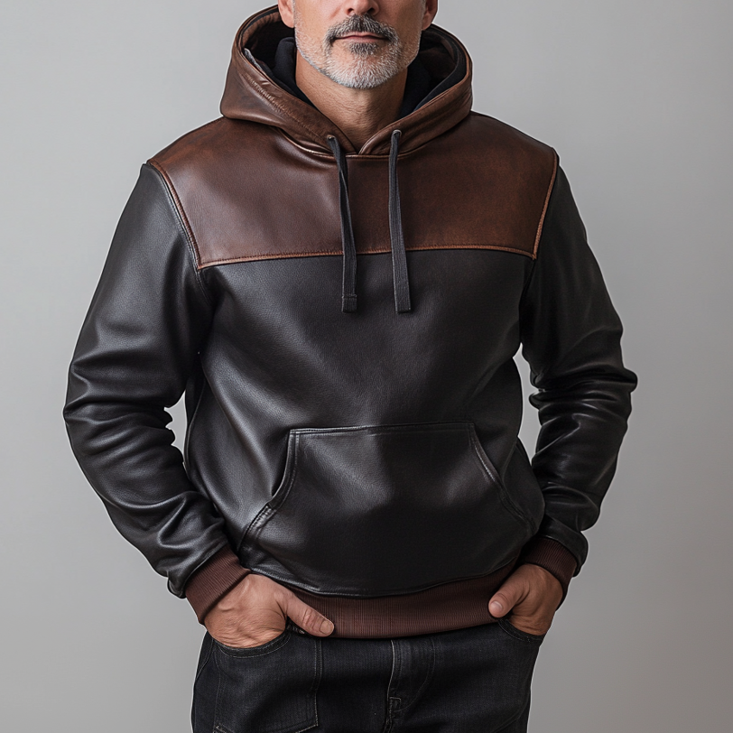 Men's PU Leather Color Block Drawstring Pocket Hoodie