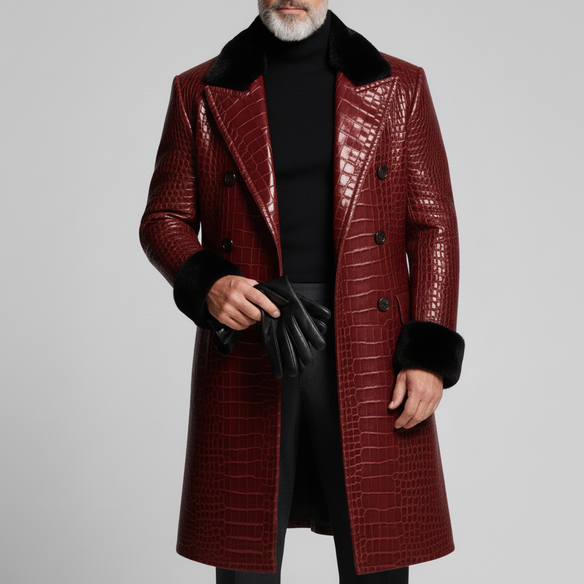 Men's Burgundy Crocodile PU Leather Plush Peak Lapel Double Breasted Long Sleeve Trench Coat