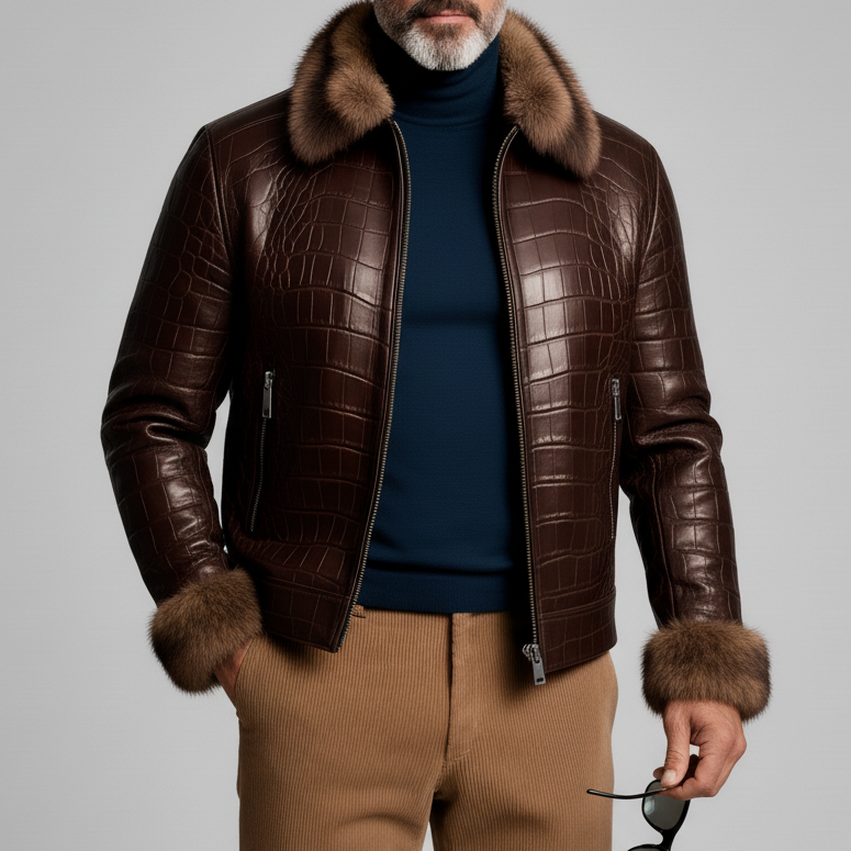 Men's Brown Fur Collar Long Sleeve Zipper Pocket Crocodile PU Leather Jacket