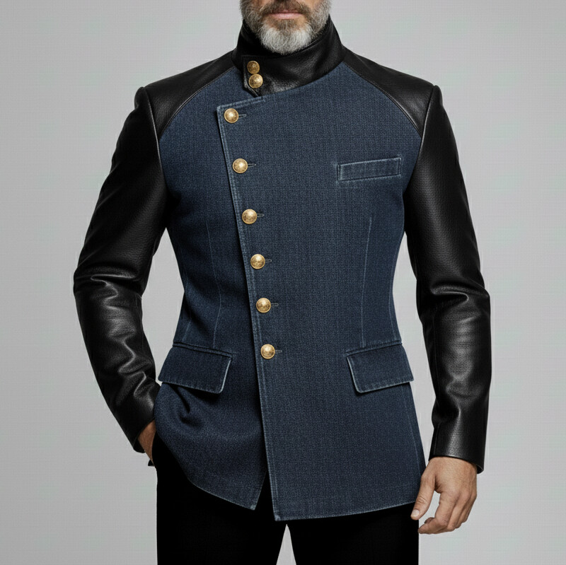 Men's Navy Blue Denim PU Leather Patchwork High Collar Long Sleeve Asymmetrical Button Jackets