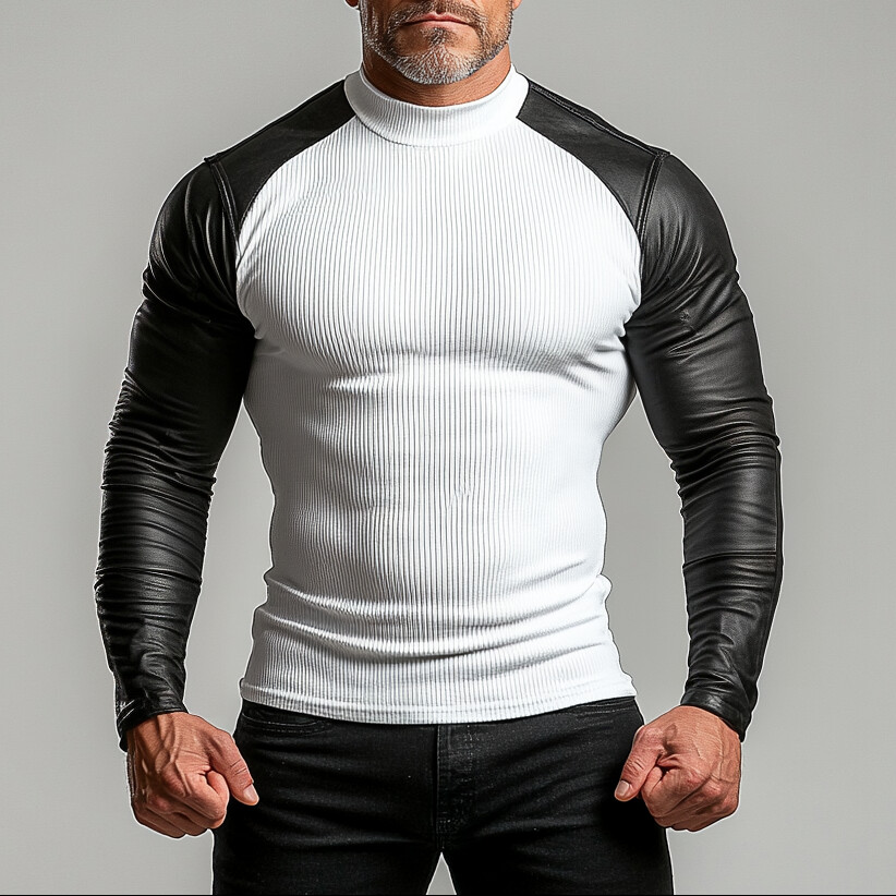 Men's Contrast Color PU Leather Patchwork Long Sleeve T-Shirt