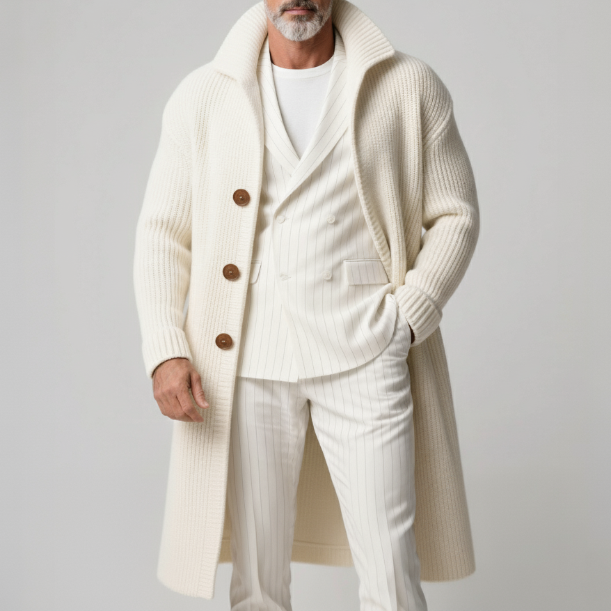 Men's Off White Ribbed Knit Turndown Collar Long Sleeve Button Mid-Length Sweater Overcoat